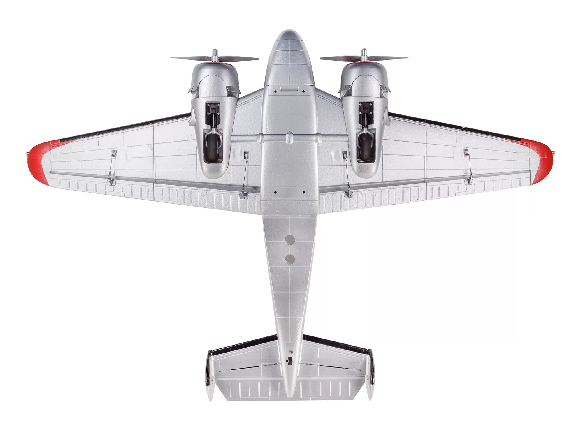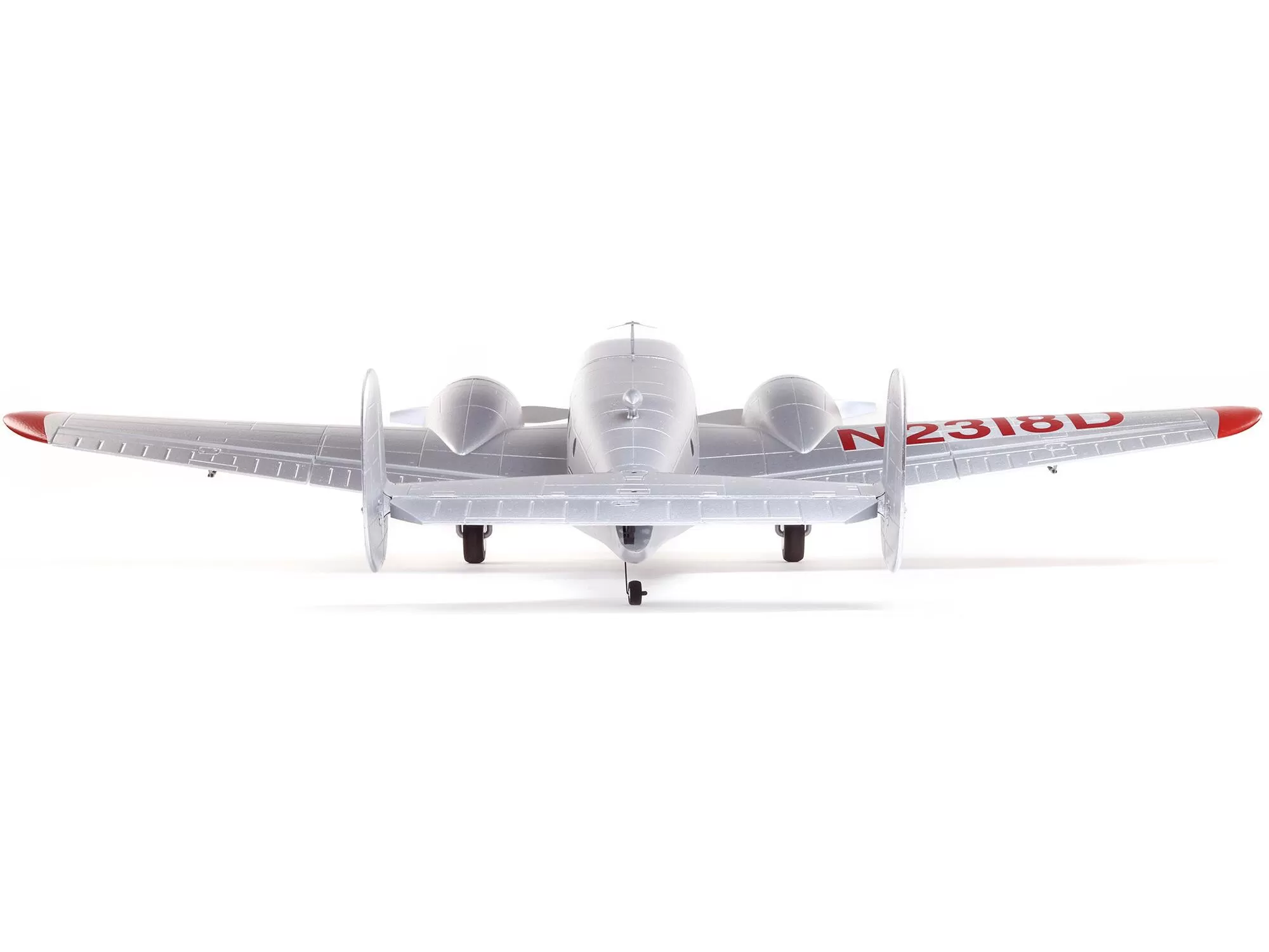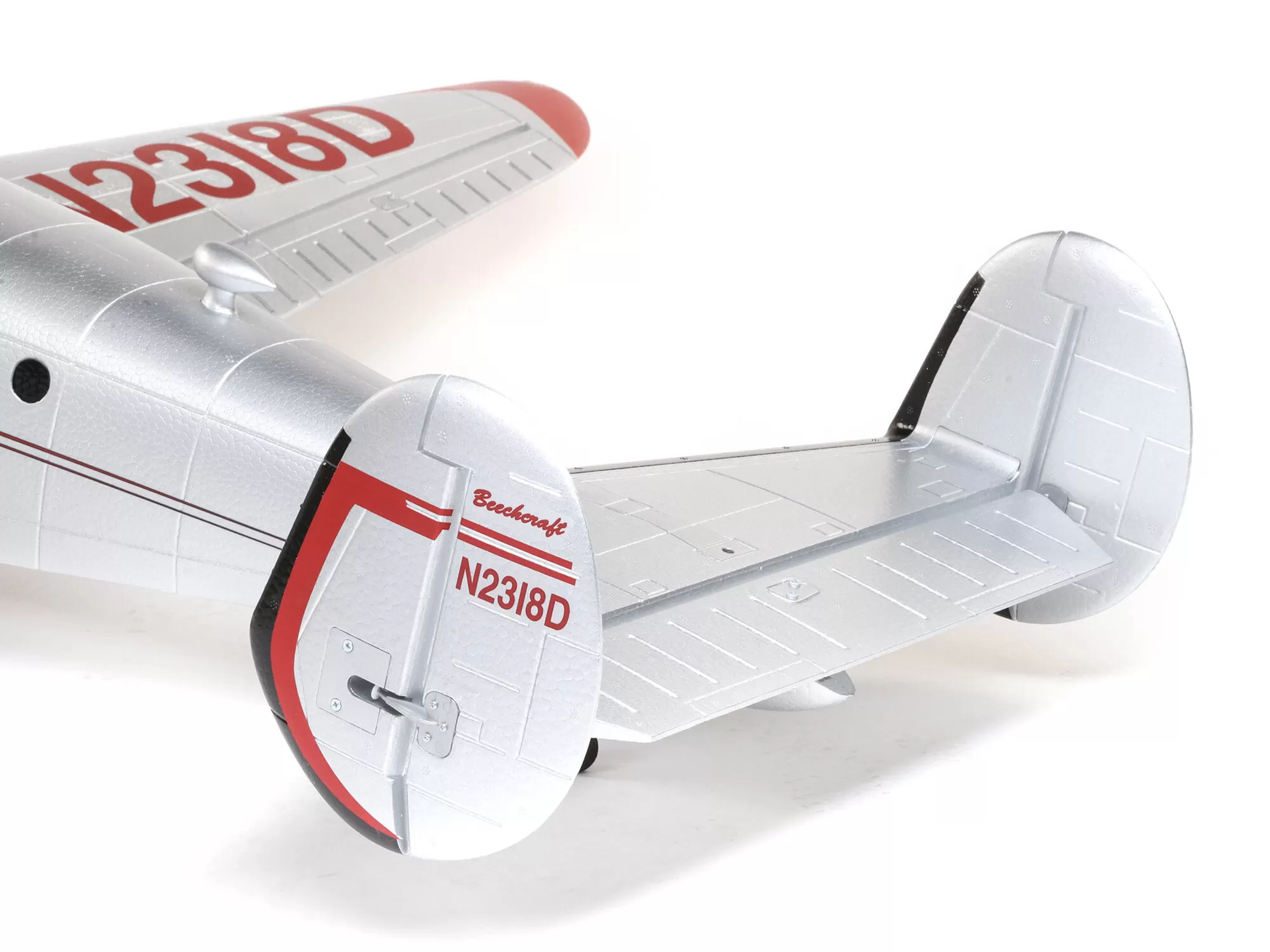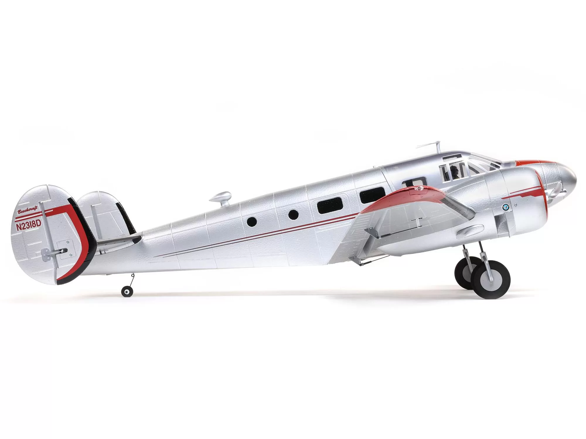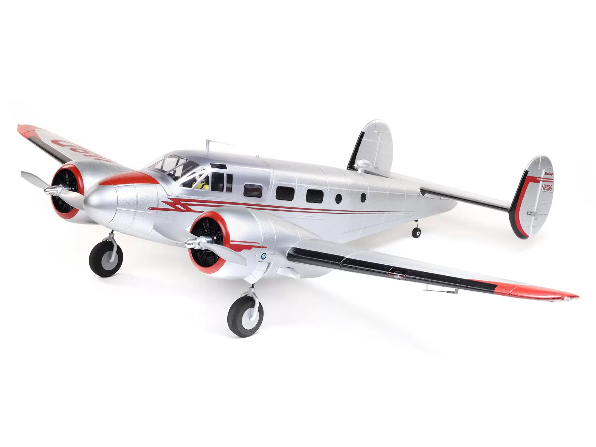 This is the only Beechcraft D18 model equipped with both exclusive Spektrum™ AS3X® and SAFE® Select technologies. AS3X works behind the scenes to smooth out the effects of wind and turbulence to deliver a locked-in feel that makes it seem like you’re flying a much larger airplane. Optional-use SAFE Select offers pitch and bank angle limits along with automatic self-leveling that can be turned on and off at the flip of a switch, making this the easiest to fly D18 yet! And if you don’t want to enable the SAFE Select features, simply bind the receiver normally and only AS3X will be active.