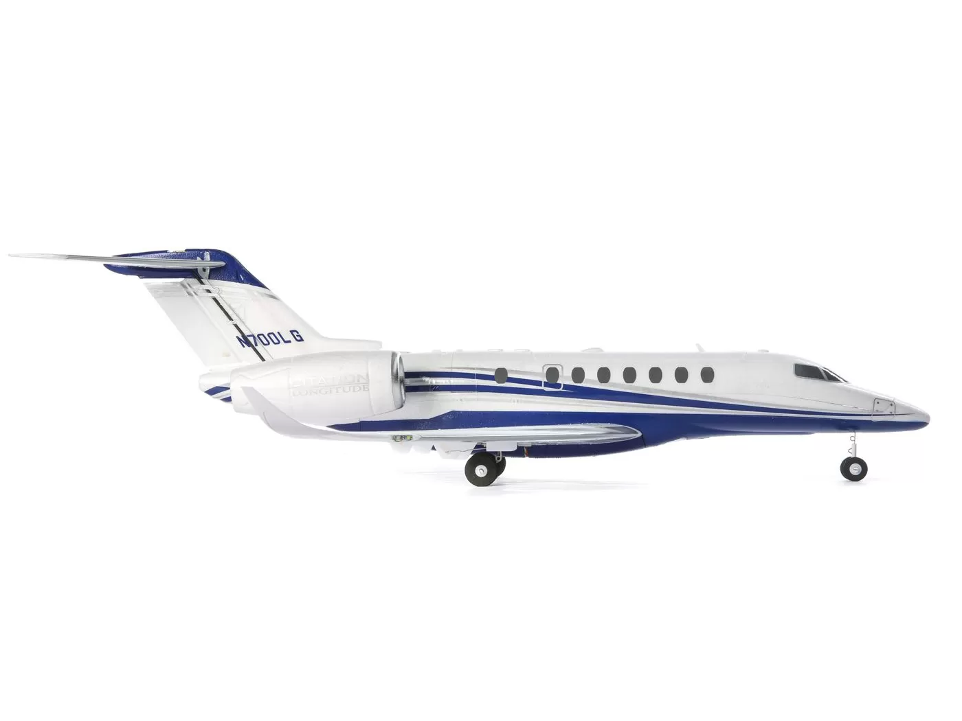 Designed to redefine the super-midsize private jet segment, the Cessna Citation Longitude is expected to revolutionise business travel by offering more range (up to 3500 nautical miles) while carrying greater payloads at higher cruise speeds (up to 550+ MPH). The E-flite® UMX™ (Ultra Micro eXtreme) Citation Longitude is an officially-licensed scale replica of the icon in the making that redefines performance for ultra micro class EDF jets by being the most powerful model in its class yet.