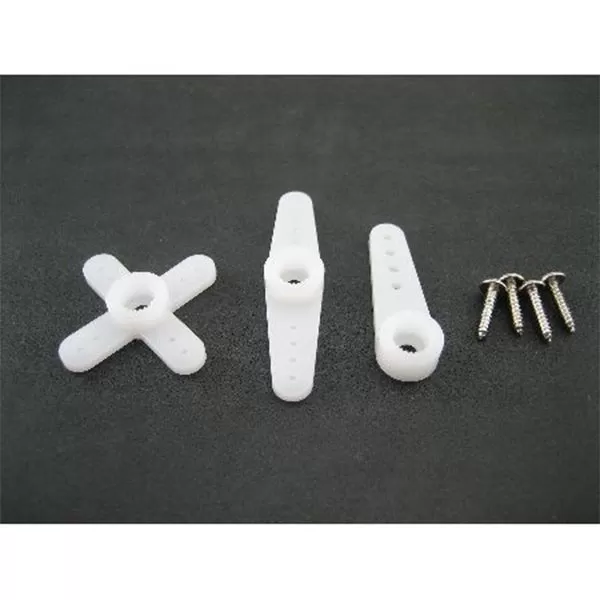This is the replacement HS-65HB/MG servo horn set from Hitec. This set contains one star shaped horn (24mm), one short (25.4mm), and one long (35mm) servo arm. Set also includes mounting screw to mount servo horn to servo and lock washers.
