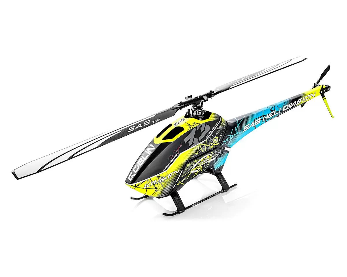 This is the SAB Goblin Kraken 580 Electric Helicopter Kit w/Main & Tail Blades. With the Kraken 580 you get a high performance and very stylish 3D helicopter without having the big ticket price tag.  It comes from the factory with mini servo mounts, yet it can accept full size servos with a large servo mount kit (sold separately)  This helicopter is designed to run on a single 6s lipo, however you can run it on 8,10 or 12s and ramp up the insanity. This helicopter is able to run a main blade size of snappy 550mm to floaty 610mm. Â